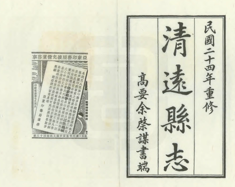 地区:广东省清远市地方志 书名:民国清远县志 卷数:二十一卷附图一卷 作者:吴凤声修 余棨谋修 朱汝珍纂 版本:民国二十六年铅印本 格式:原书原貌彩色高清PDF电子影印版 大小:150.18 MB 页码:1352双页 广东省清远市地方志,清远县志(民国)民国26年(1937年),县长吴凤声、余启谋修,朱汝珍总纂,共21卷,叙事至民国25年PDF高清电子版影印本下载。铅印本,清远市史志办公室等单位存。民国9年4 月,县长张鉴藻曾设局于岐新公所修县志,聘朱汝珍为总纂,因事中辍。民国23年春,县长吴凤声重设局于潖江公所,命克期编辑,民国26年初稿成,“较旧志增两倍有奇,时余启谋继任,审定印行,是志订正者十之二三,增补者十之五六,集前志之所有,补前志之所缺,广而续之,考订校仇详核,可称完备”。