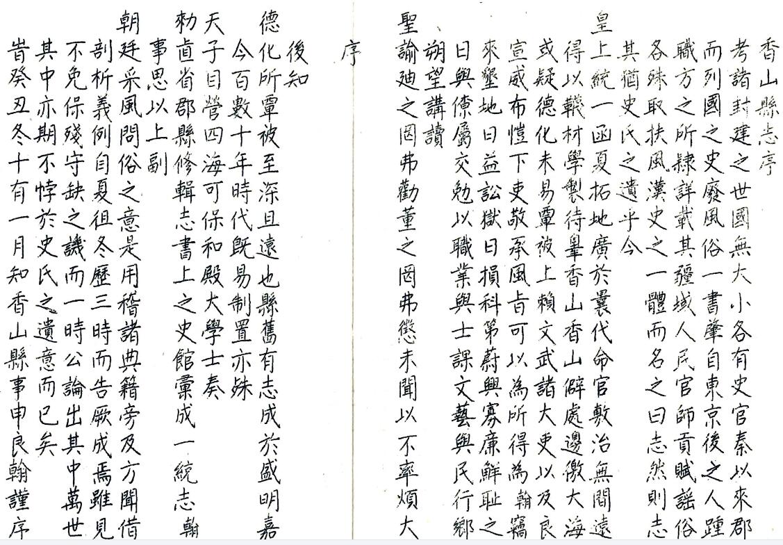 [康熙]香山县志(申志)十卷,(清)乾隆年间知县申良翰纂修, 邑人何准道、欧阳羽文等辑。十卷 油印本 民国间[1912-1949]