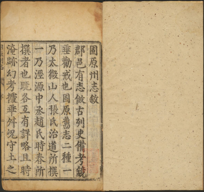 地区:宁夏固原市地方志 书名:万历固原州志 卷数:二卷 作者:刘敏宽 董国光纂修 版本:明万历四十四年(1616)刘汝桂刻本 格式:高清彩色PDF电子影印版 大小:32 MB 页码:117双页